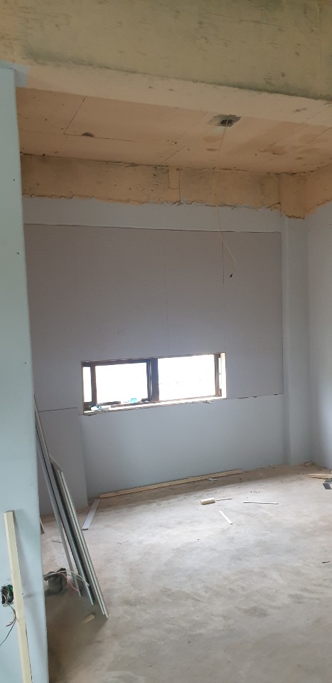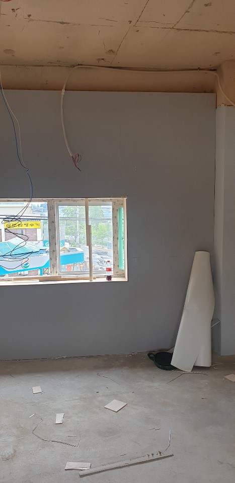 석고보드 시공이 끝난 후 가운데 창문 쪽에는 가벽과 창문 사이의 공간에서 좌우 위아래 뻥 뚫려있기 때문에