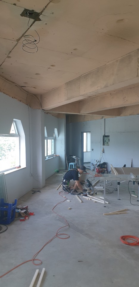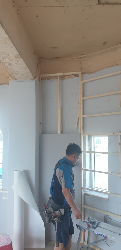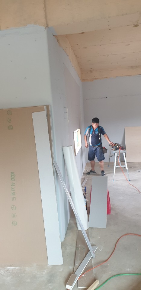 이제 우리 팀장님께서 작업하시는 모습! 목상을 걸어두고 석고보드를 시공 중이시네요!