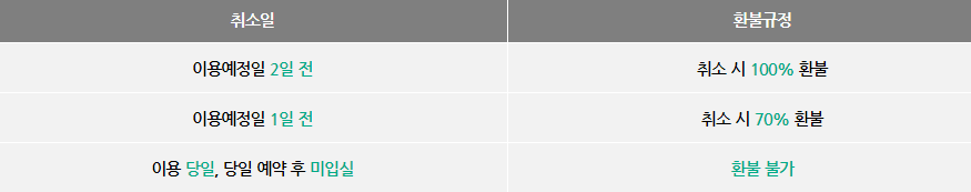 예약을 취소할 경우, 이용 예정일 2일 전까지는 전액 환불이 가능하며 1일 전에는 70% 당일취소와 당일 예약 후