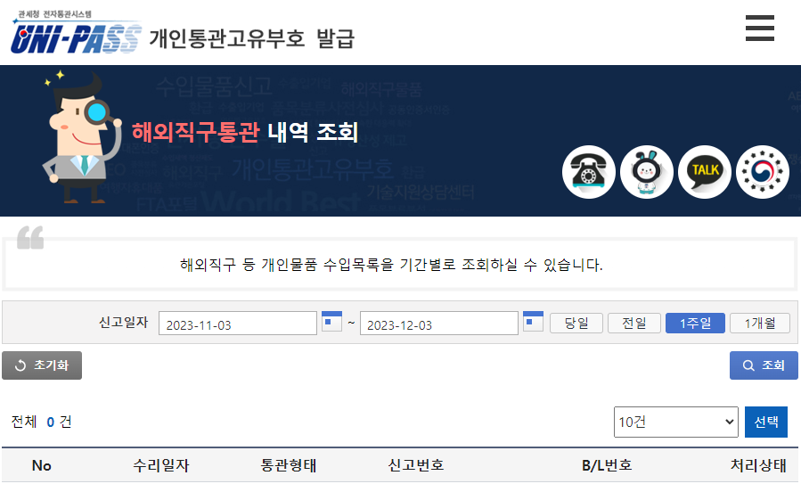 메인 화면에서 표시된 부분을 클릭하시면  해외직구 통관내역조회 < 버튼이 있습니다.
