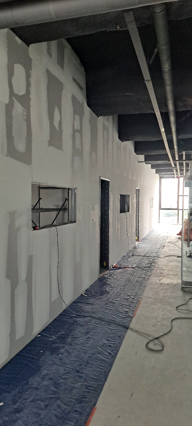 천정에 검정색으로 페인트(수성) 에어리스작업을 진행하여주고, 벽면은 석고보드로 시공되어 있기 때문에 망사테이프를 시공 후 핸디퍼터 작업을 진행하였습니다. 시공 순서는 벽면 핸디퍼터 작업이 모두 끝난 후 천정작업을 진행하셔야 천정과 벽면 만나는 부분이 깔끔하게 마감됩니다.