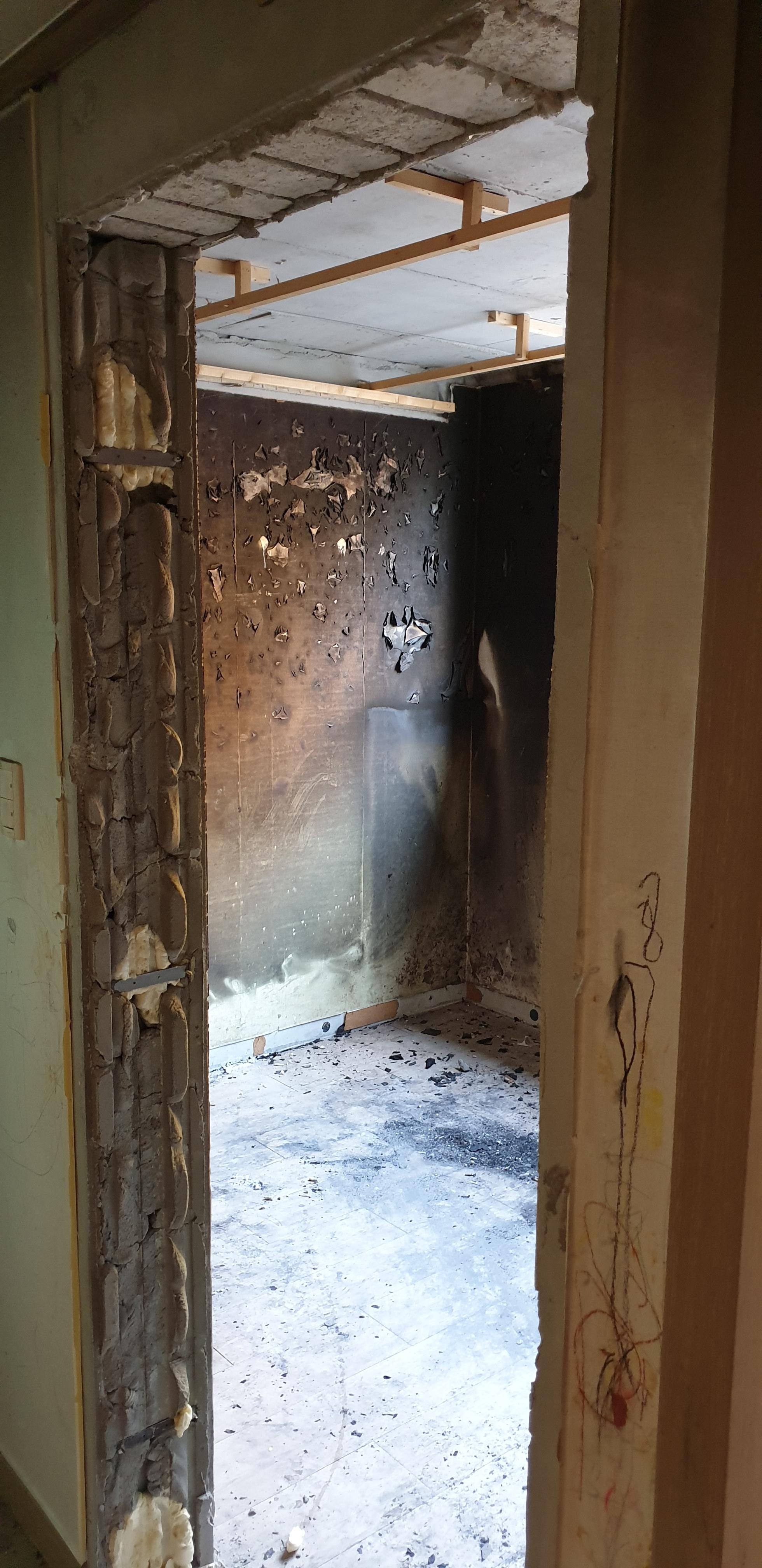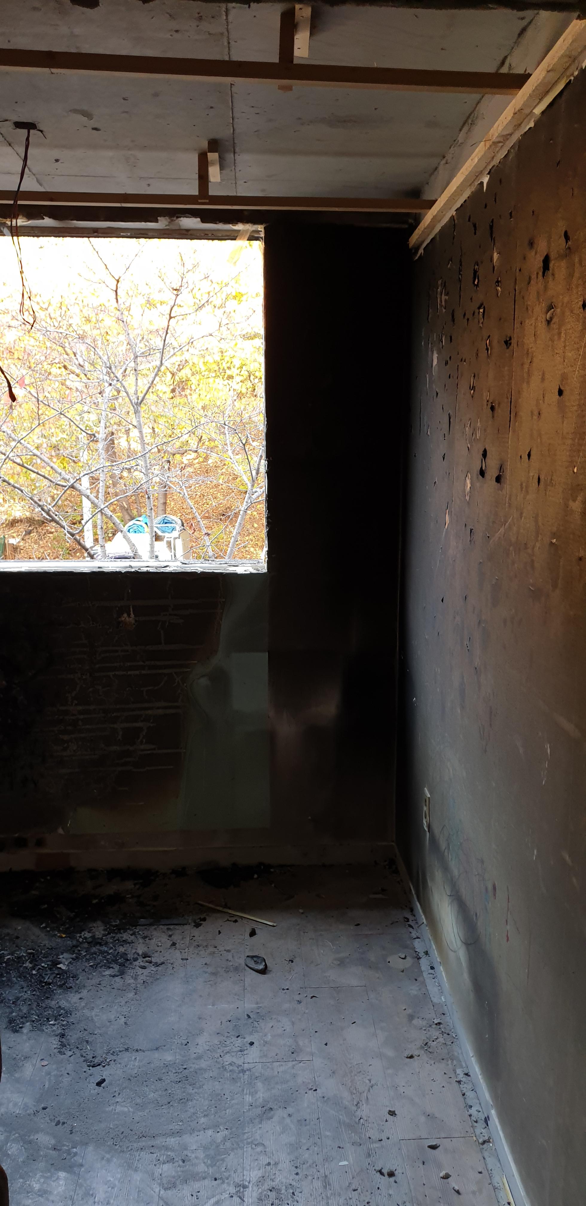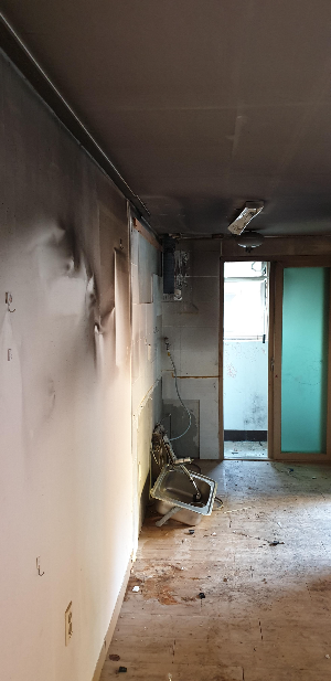 아이가 초를 갖고 놀다가 발생된 화재인데요. 다친 사람은 없어서 다행입니다. 보시는 것처럼 부분 화재로 방 한 칸이 타버렸습니다, 문제는 집 전체에 화재로 인한 그을음 및 분진이 퍼져버렸다는 것인데요. 피해복구를 제대로 하지 않으면 그을음냄새가 계속 나올 수 있기 때문에 전체적인 철거가 필요한 상황이었습니다. 거실 쪽은 그을음만 피해를 입었고 입구방, 화장실도 그을음 피해를 입었기 때문에 철거를 진행하였습니다.
