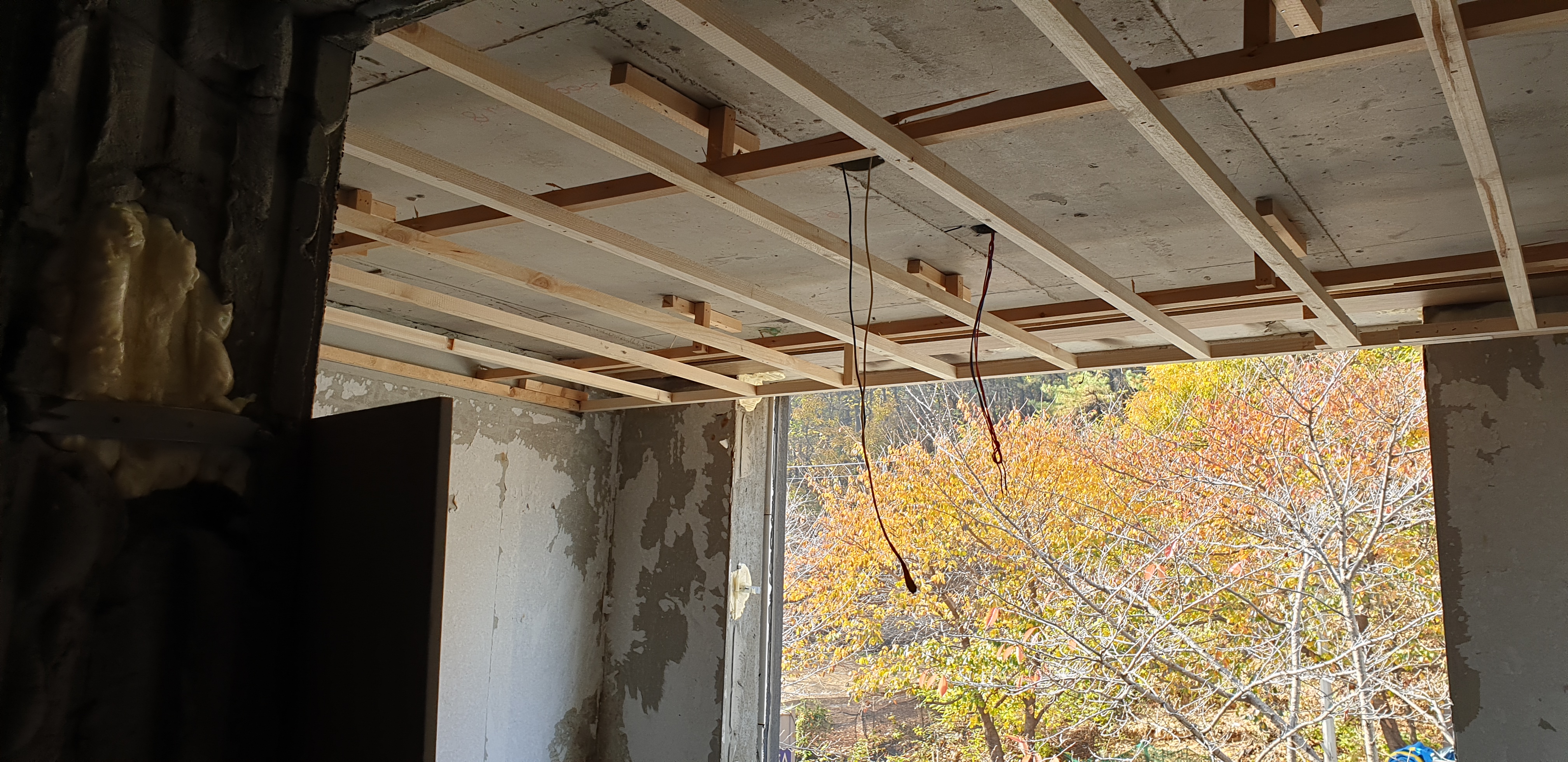 천정까지 제거 후 목상철거하고 재시공을 하였습니다. 이유는 그으름이 석고보드 속까지 자리를 잡았기 때문에 시간이 지나면서 냄새 및 도배지가 누렇게 변하현상이 생기므로 꼭 천정 철거 후 재시공을 해주셔야 합니다.