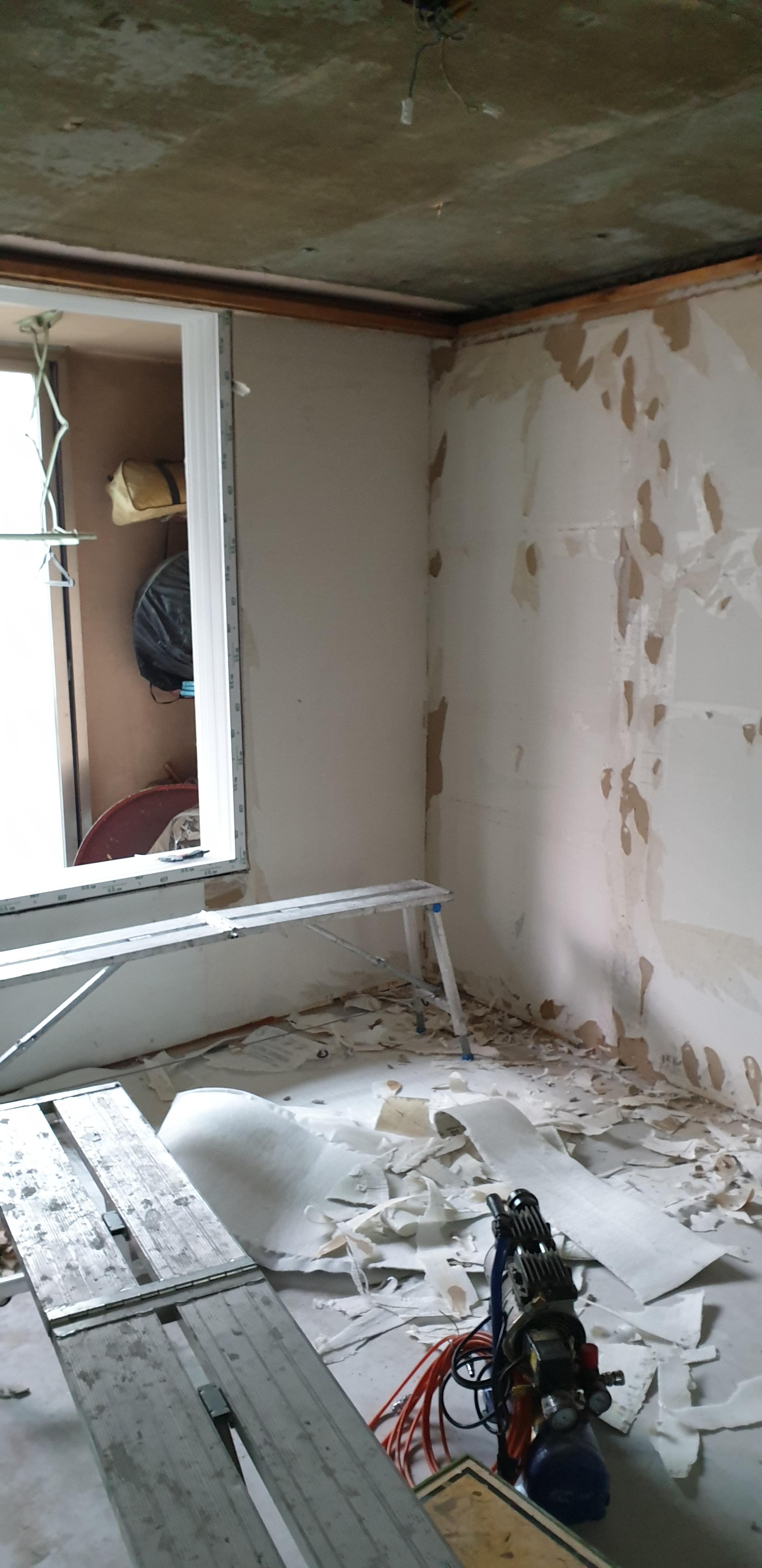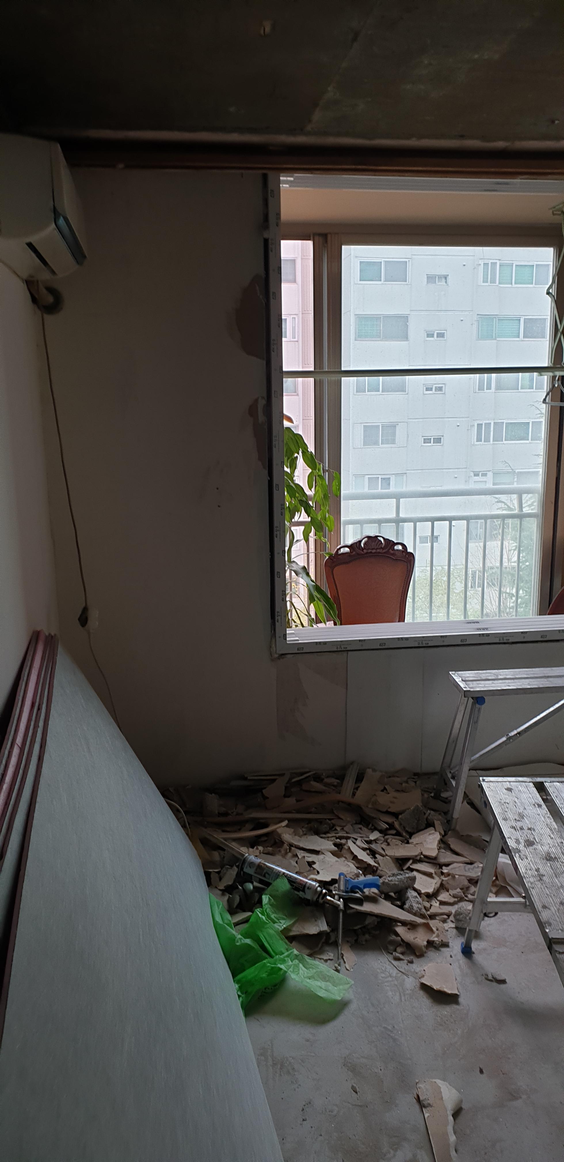 빠른 복구를 위해 철거와 동시에 시공을 진행하였습니다. 천정철거+ 섀시철거+도배지철거+장판철거를 진행 후 새시를 급발주 하여 오후에 받아올 수 있었습니다.