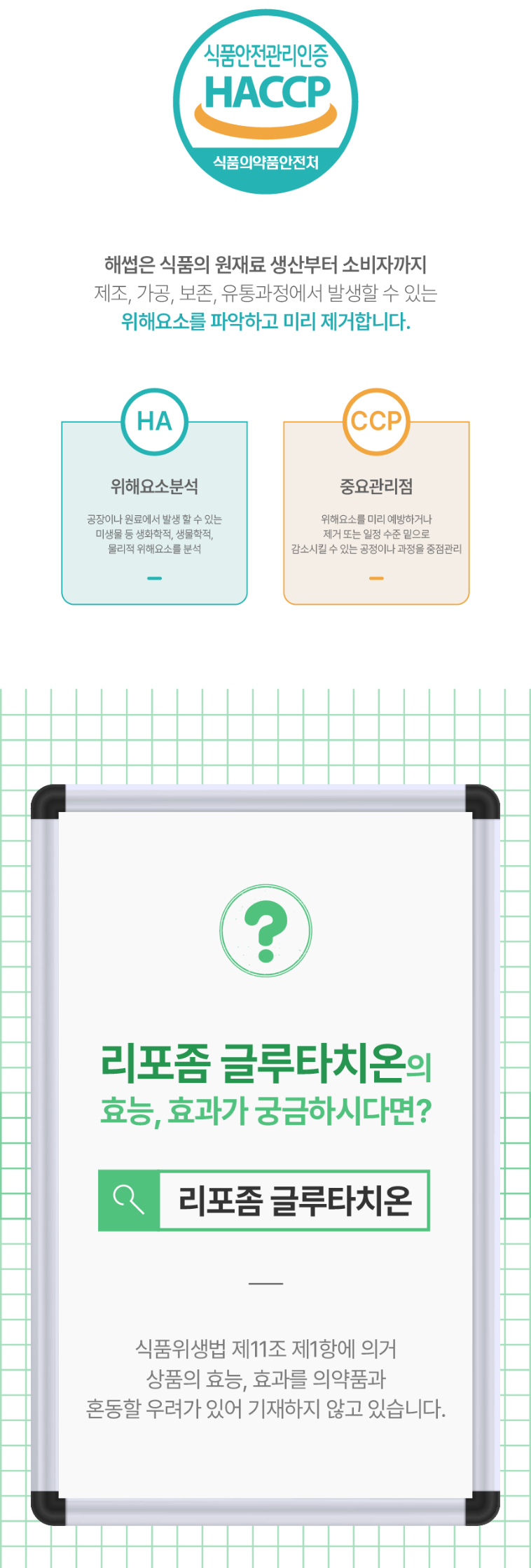 제품 안전성에 대한 걱정도 많으실 텐데요, 리포즘 글루та치온은 HACCP 인증을 받은 안전한 제품입니다.