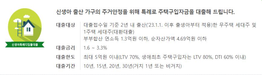 이 대출에 해당하는 가구는 신생아 출산한 후 2년이내 무주택 가구 또는 1 주택 가구입니다.