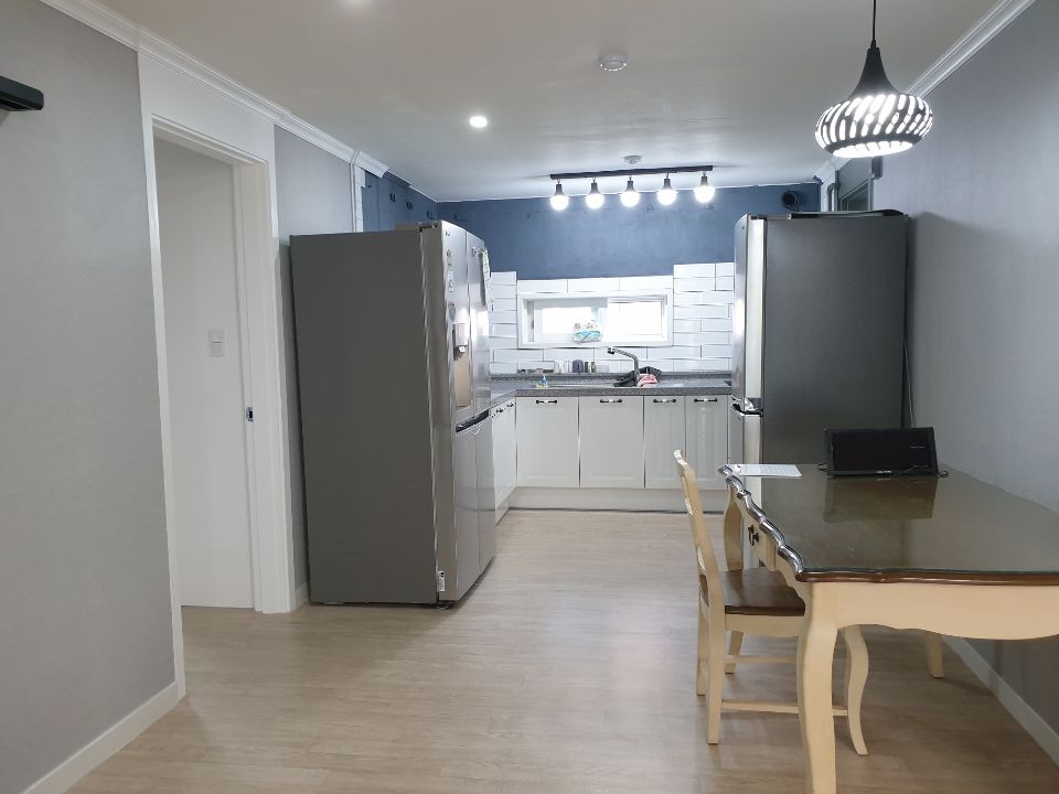 천정 도배가 끝난 후 가구 배치를 하고 찍은 사진 주방 쪽입니다. 싱크대 상부장의 경우 화재 발생 시