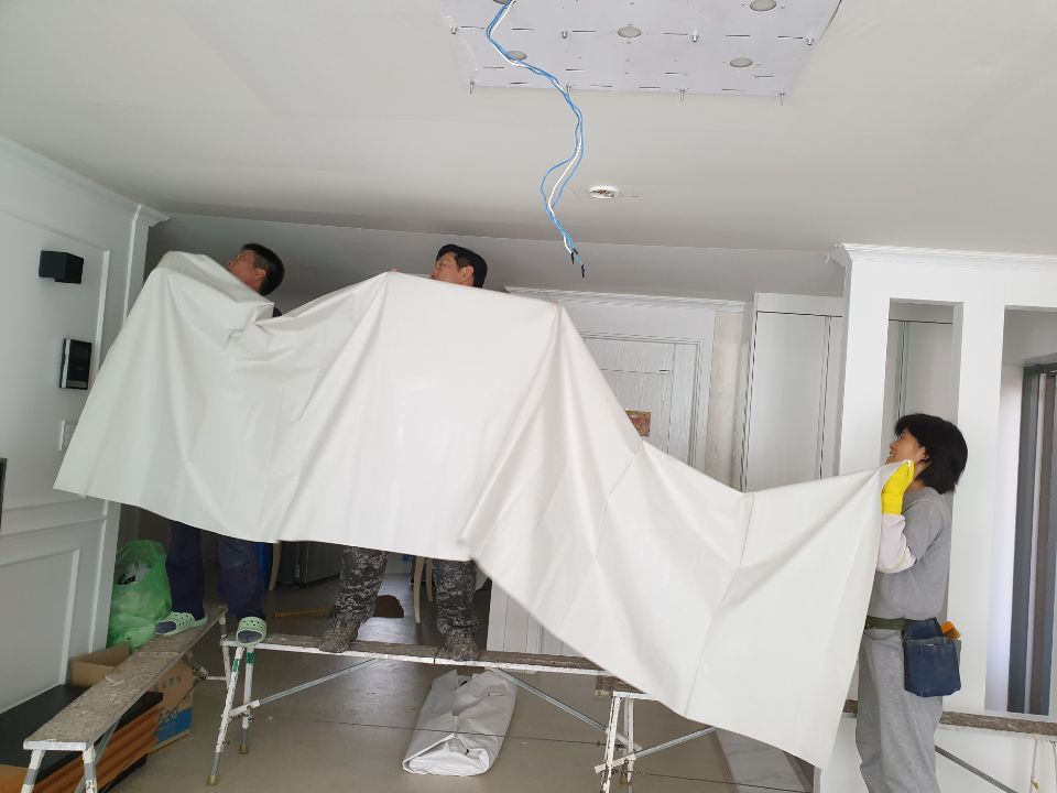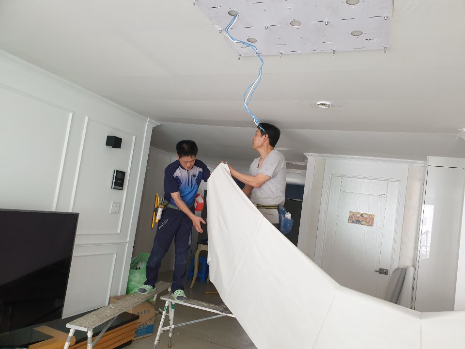 천정 실크 작업의 경우 혼자서는 불가능하기 때문에 2명 또는 3명이 팀을 이루어 작업을 진행합니다.