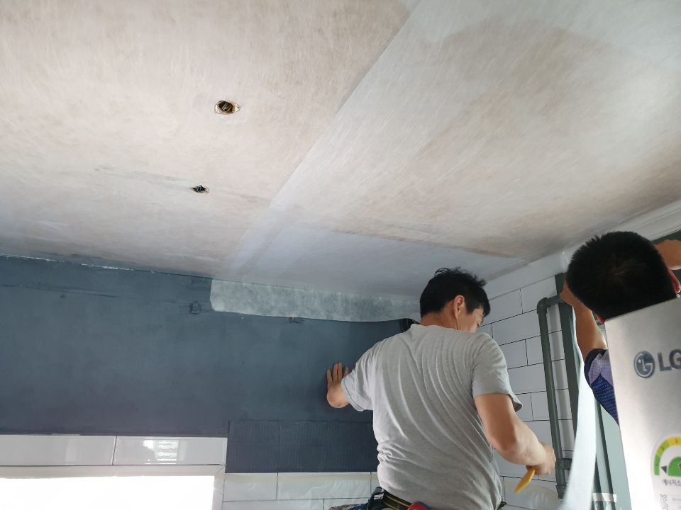 다) 있는 모습입니다. 천정에서 띄우는 이유 첫째는 도배시공 후 천정면+ 벽면의 면이 깔끔하게 처리될 수 있도록 도와주기 위함이고 두 번째는 약품처리 후 도배지에 배어 나오는 것을 방지하기 위함입니다.