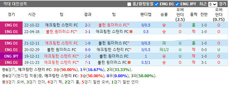 볼턴 원더러스 FC는 지난 경기가 패해서 연승을 마감했습니다. 이번에 원정팀은 지난 6경기에서 단 1경기만 이긴 애크링턴 스탠리 FC와 만나 이기겠다고 맹세합니다.
