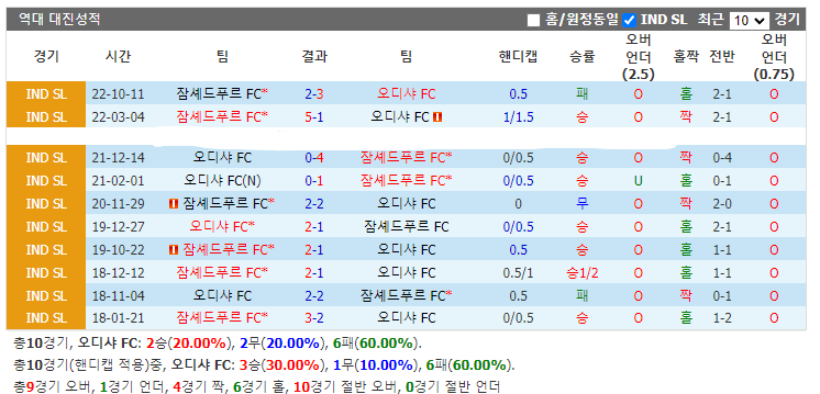 오디샤 FC는 본 시즌에 지금까지 리그 홈에서 승률이 약 70%입니다. 팀은 최근 2경기에서 경기당 3골을 넣었습니다. 이번에 공격력이 강한 홈팀은 잠셰드푸르 FC와 만나 승점 3점을 얻을 거라 생각합니다.