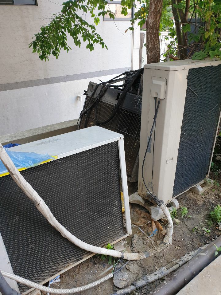 멀쩡한 실외기 뒤에 보이는 저 저 저 저... 까맣게 변해버린 실외기가 화재의 원인인 실외기입니다.