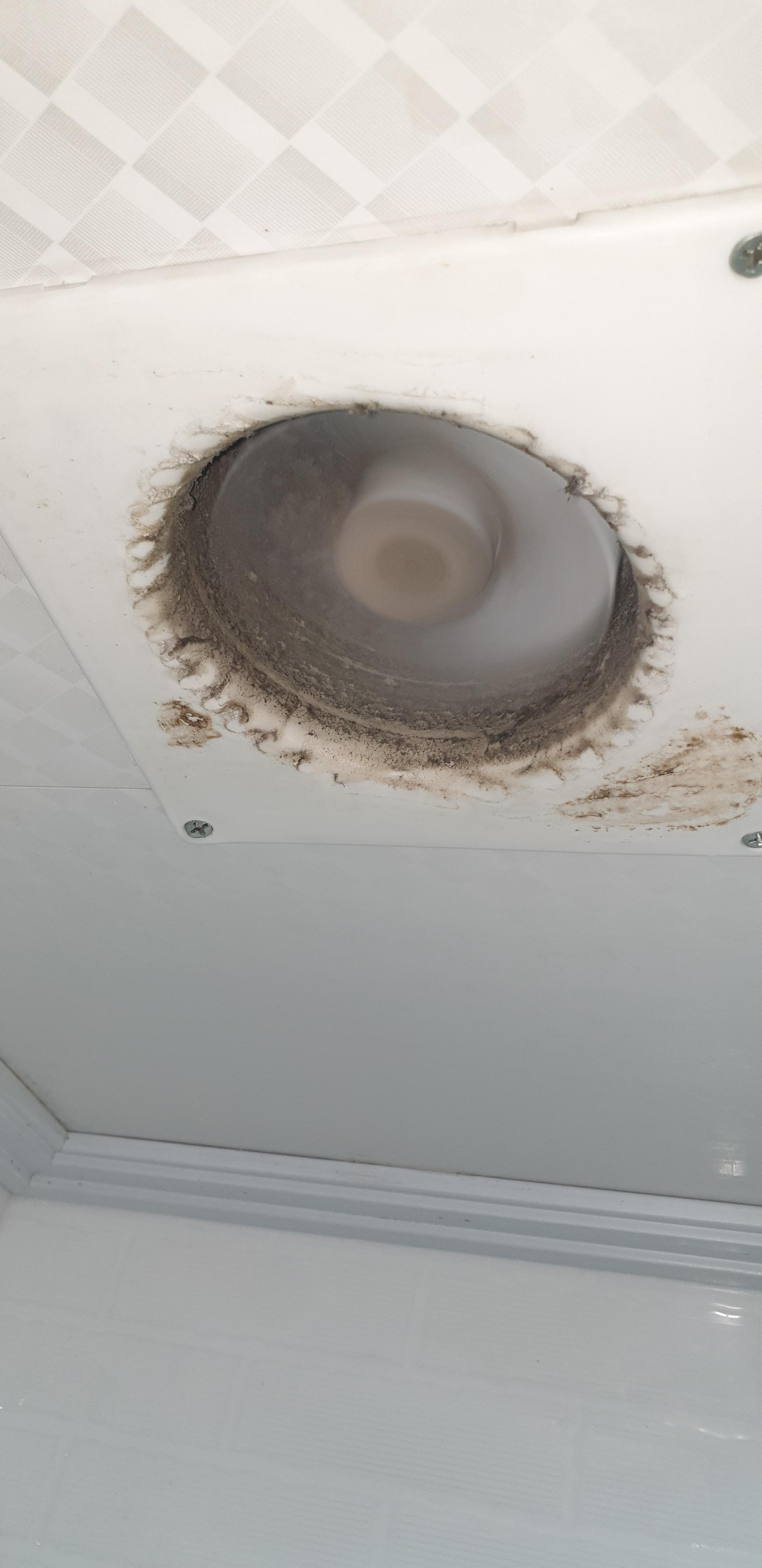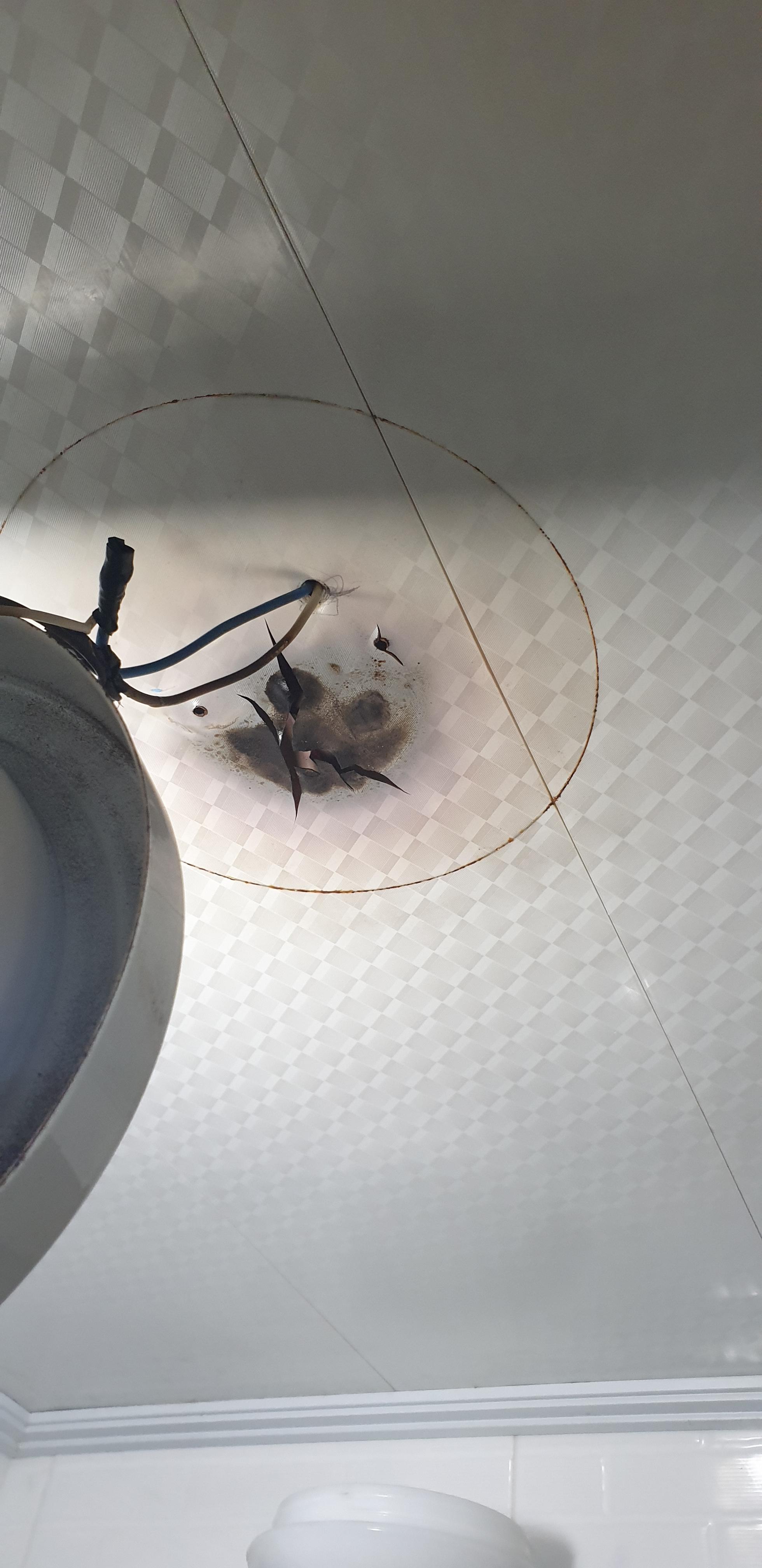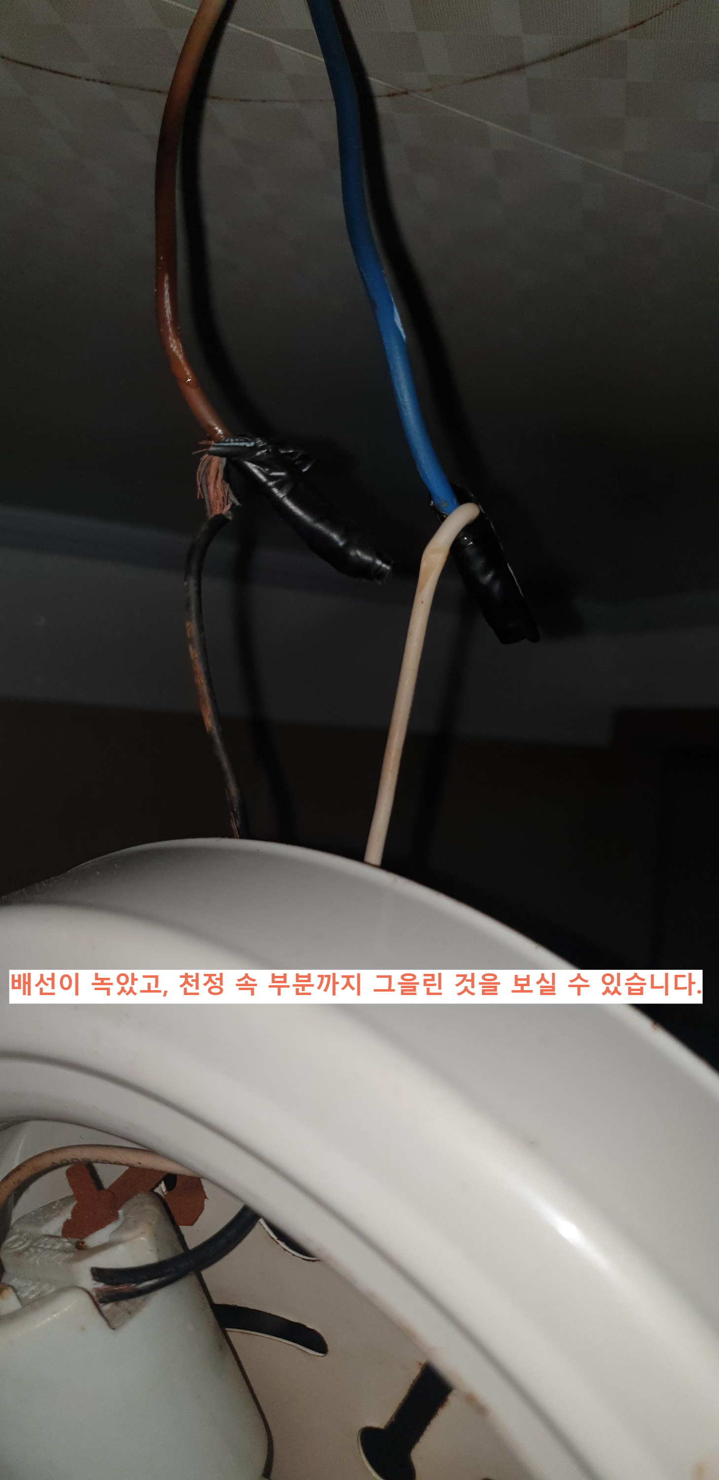 환풍기, 직부 등도 교체를 위해 철거를 하였는데요. 예상대로 직부등의 경우 천정(리빙 보드)가 그을리고, 열에 의해 타버린 것을 보실 수 있습니다. 화재의 위험성이 있는 부분인데요. 차단기를 내리고 배선도 쭉 당겨 확인해 본 결과 리빙 보드 속까지 그을린 것을 볼 수 있습니다. 문제가 되는 부분까지 과감하게 잘라내주시고 조명(LED 원형 방수 등)을 설치해 주시면 됩니다.