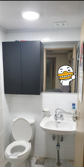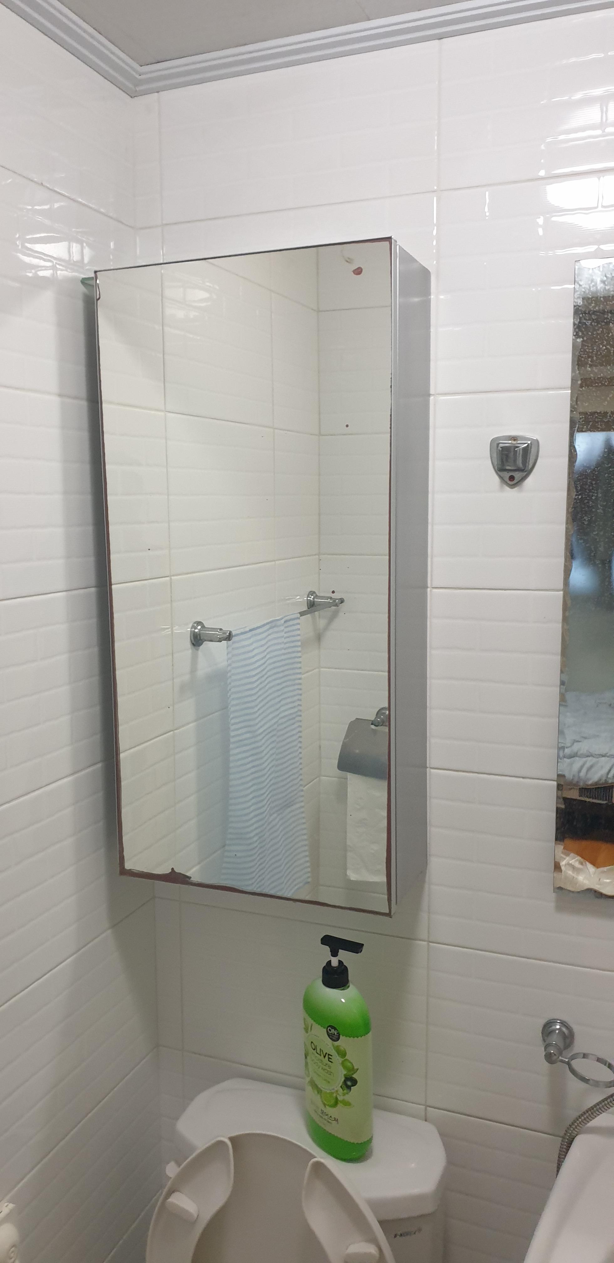 기존 수건장,거울,직부등(일반) 너무 낡았습니다. 전부 뜯어서 과감히 버려 주고요. 기존 수건장과 거울이 오래되었다는 걸 보여주듯 모양 그대로 뒷면에 물때가 있는 것을 확인할 수 있습니다.