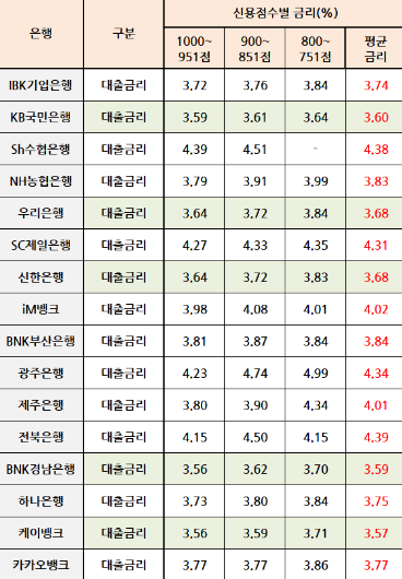 평균금리가 아닌 신용점수별 평균금리를 확인하시는 것을 추천드립니다.