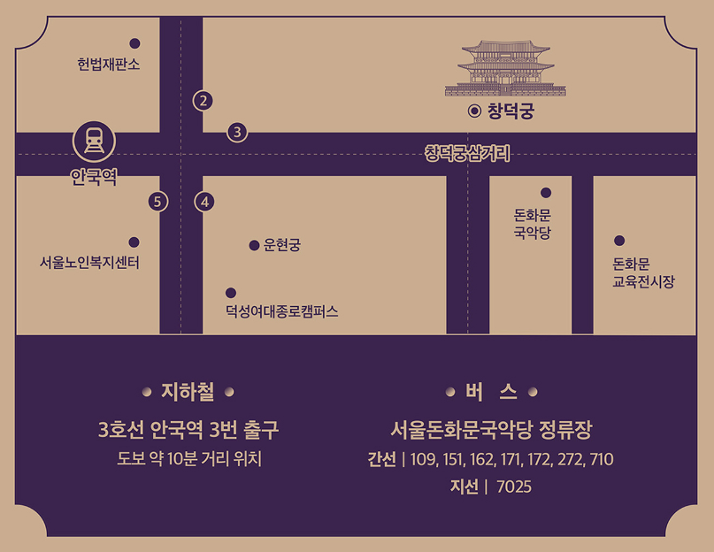 버스를 이용하실 경우, 안국역 또는 창덕궁 앞 정류장에서 하차하시면 됩니다.