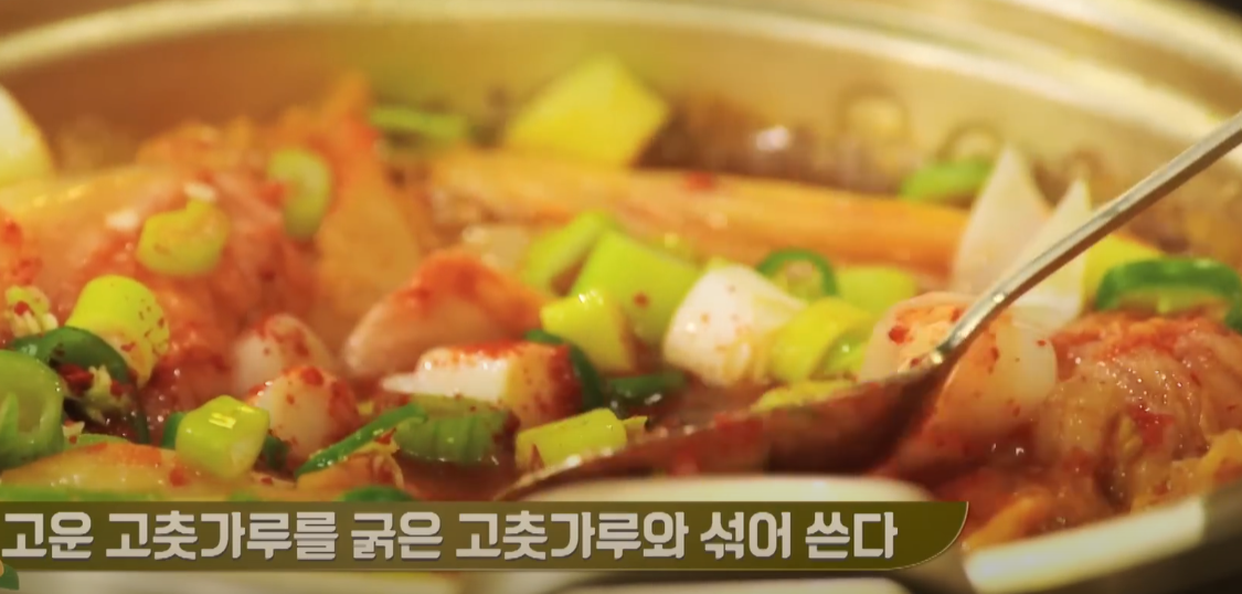 고운 거 반숟갈, 굵은 거 반숟갈을 넣어주고, 국간장을 한 숟갈 넣어 향을 내주고