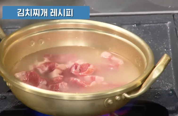쌀뜨물과 돼지고기를 넣고 끓여줍니다. 돼지고기는 오래 삶을 수록 기름이 많이 빠져나와