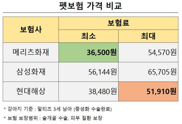 이 비교는 Maltese 강아지를 기준으로 하여, 최소 및 최대 보험료를 보여주고 있습니다.