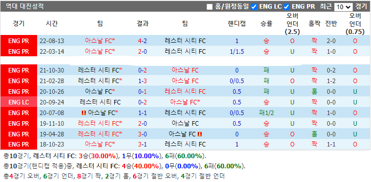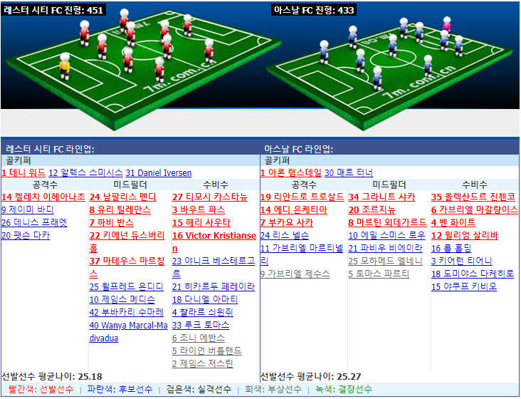 아스날 FC는 지난 라운드에서 원했던 승리를 거두며 1위로 복귀했습니다. 그렇지만 1위 쟁탈전은 여전히 매우 치열한 상황입니다. 아스날 FC는 최근 레스터 시티 FC를 상대로 4연승을 거뒀습니다(11득점 3실점). 아스날 FC는 이번 원정에서 승리를 거둘 것이라 예상합니다.