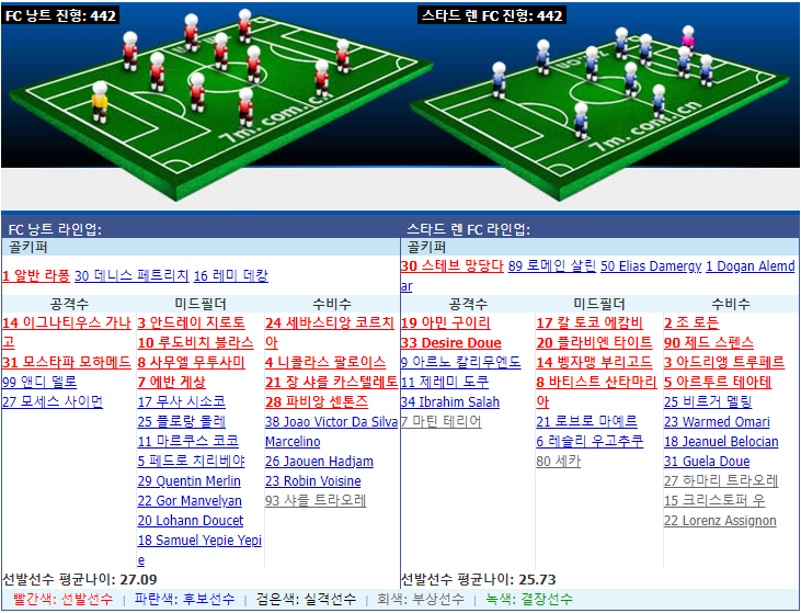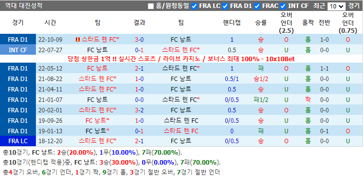 스타드 렌 FC는 본 시즌 원정에서 발휘가 좋지 않고 승률이 20%에 불과합니다. 하지만 팀은 양팀의 역대 대진전적에서 우세를 차지하고 최근 FC 낭트와의 대진 10경기가 승률이 70%이니까 이번에 원정에서 패하지 않을 거라 예측합니다.