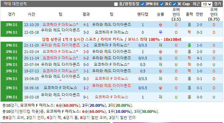 요코하마 F 마리노스는 요즘 우라와 레드 다이아몬즈를 상대로 10경기에서 승률 60%에 이르렀습니다. 요코하마 F 마리노스는 새 시즌 리그 첫 라운드에서 가와사키 프론탈레를 격파했습니다. 요코하마 F 마리노스는 이번 홈에서 승리를 거둘 것이라 예상합니다.