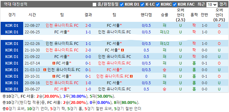 FC 서울은 최근 인천 유나이티드 FC와의 대진 홈 2경기가 다 비겼습니다. 두팀은 실력이 막상막하라서 이번에 비길 거라 생각합니다.