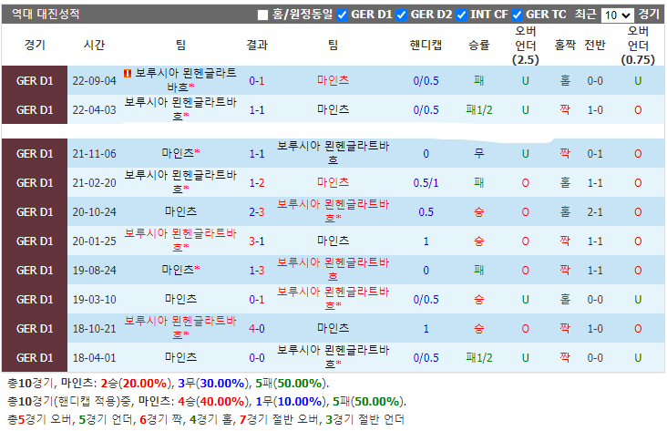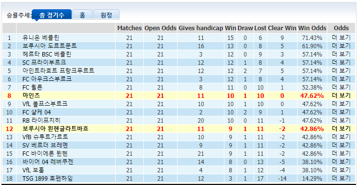 보루시아 묀헨글라트바흐는 올 시즌 승점 29점 중 7점만 리그 원정에서 획득했습니다. 마인츠는 최근 컨디션이 좋아서 리그 4경기에서 3번에 승리의 맛을 봤습니다. 마인츠는 이 동안 홈 2경기에서 매경기 적어도 3득점을 터뜨렸습니다. 그래서 마인츠는 이번 홈에서 높이 평가해 드릴 만하다고 생각합니다.